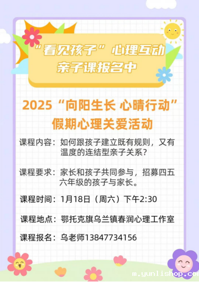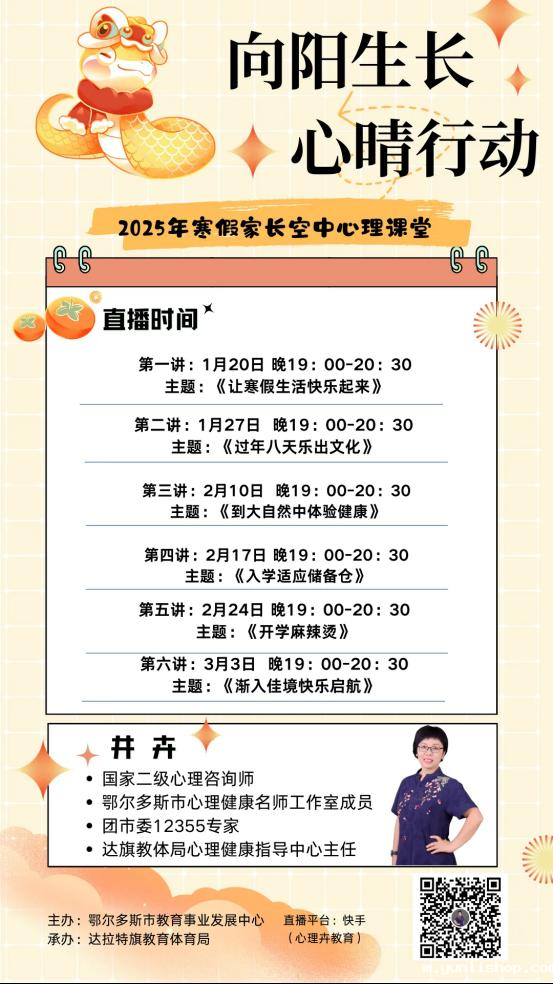 为进一步帮助学生及家长享受假期生活,鄂尔多斯市教育事业发展中心开展了“向阳生长 心晴行动”寒假心理关爱主题活动。我们的心理老师将会在线上家长空中课堂为家长们从学习、生活、入学适应等多种角度提供更多的心理小贴士。幸福寒假,易如反掌。